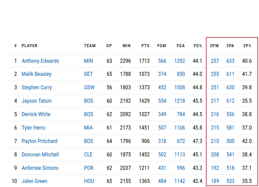 联盟三分榜前10:爱德华兹比斯利前2 库里和第一仅差6记三分!