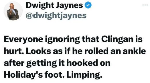 据美国体育记者@Dwight Jaynes的报道:克林根疑似在赛中被队友霍勒迪的脚勾到,扭伤了自己的脚踝,走起路来一瘸一拐。