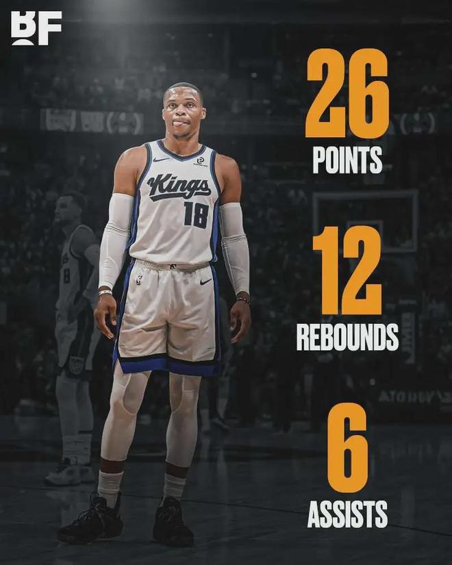 四节比分(国王在前):30-39、33-33、30-32、31-25。本赛季至今,威少在国王打了7场,其中3场首发。场均出战27.6分钟,得到13.9分5.9篮板5助攻1.4抢断2.4失误,投篮命中率43.2%,三分命中率39.4%,罚球命中率70%。